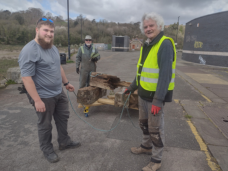 On a sunny Saturday we were delighted that ten volunteers and three visitors attended. Retired conservation architect Bruce Induni came up for Tounton to share the day with us, whilst Sheila Hannon and Julien Weston from local theatre 'Show of Strength' joined Bruce for an interesting tour of the heritage features on and around the Knuckle. Our volunteers moved more large timbers donated by Bristol City for future refurbishment projects, whilst Chris from Warminster and his friends vanquished weeds. Howard and Peter fitted several new timber strakes to Brunel Lock winch, whilst new volunteers Tia and Sabine, both Bristol University students, focussed on renewing the protective coverings on the bearings of a wheel designed by Brunel in 1849 but now 'retired' and stored under the deck. Thank you for all your hard work folks!